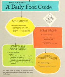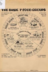 The next prominent food guide was “The Basic 7 Food Groups” and came with cute slogans like, “Eat a lunch that packs a punch!” These marketing campaigns were clearly driven towards the World War II efforts in keeping a healthy and strong population.