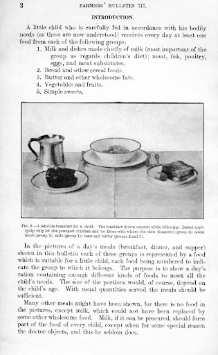 The guide in 1916 was called “Food for Young Children”. Food was divided into 5 different categories being milk based dishes, bread and cereals, butter or wholesome fats, vegetables and fruits, and lastly simple sweets.